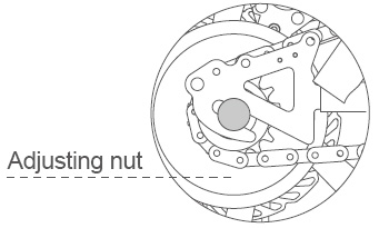 Rotate to loosen the nuts. Adjust the nut forwards or backwards to find the suitable looseness. When adjusting the chain, it must also be aligned with the rear nut and adjusting nut and keep the front and rear wheels in a straight line. After adjustment, refasten the nut in the rear wheel, lock the adjusting nut to have a final check. The chain sag between the two chain wheels should be 10~15. Clip mouth is back to the installation.