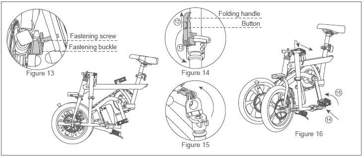 Put the fastening screw in the fastening buckle (see Figure 13). Push up the button on the handle (see figure 14- 12 arrow) and fold down the folding handle(see figure 14- 13 arrow). Fold the head as shown in Figure 15. Push the pedal up and inward (see figure 16- 14 arrow and 15 arrow) to fold the pedals.