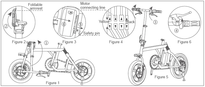 1. Take R3 out of the package bag, unfold pedals and kickstand. Push the head in vertical direction (see Figure 1 - ① arrow), the folding handle along with the bike head is to be down-and-backward to the slot and then button up (see Figure 2- ② arrow) to fasten the head. Rotate the brake to horizontal (see figure 5- ③ arrow), tighten the screws on the brake to fix brake (Figure 6- ④ arrow). Pull the safety pin gently on the fixed seat of the battery box (see figure 3- ⑤ arrow), insert the battery box (see figure 3- ⑥ arrow), release safety pin and connect the wire as showed in Figure 4 .
