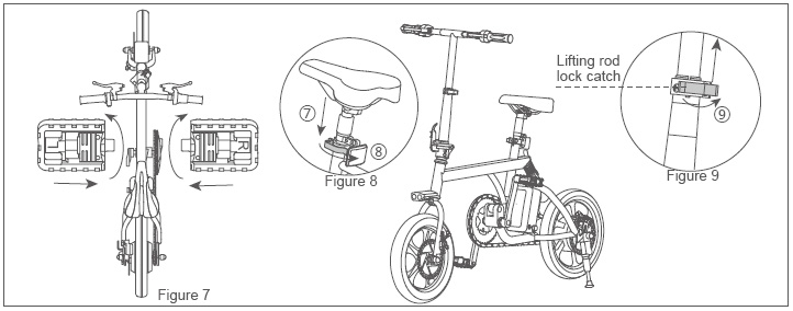 2. Install the pedals correctly (L-left, R-right) as showed in Figure 7. Please note the installation of screw tooth is the opposite. Install the left pedal anticlockwise and right pedal clockwise. 35~40N.m is the recommended torque. Adjust the saddle height and install it (see Figure8- ⑦ arrow) and close saddle's lifting rod lock (see Figure8- ⑧ arrow). Open the lifting rod lock and adjust the head height (see Figure9- ⑨ arrow) and close saddle's lifting rod lock.